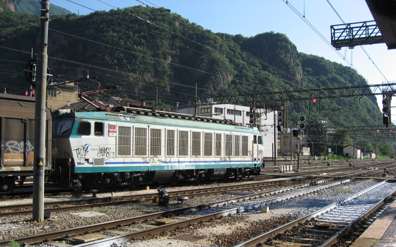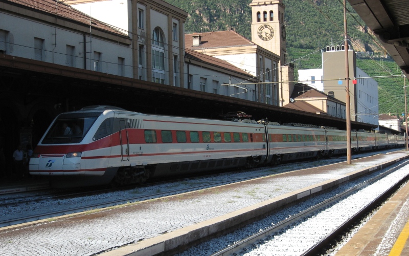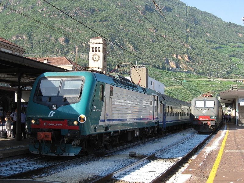 ブドウの産地、ボルツァーノの駅はそこそこ大きな駅でした。遙かかなた(画面右向こう)に、次の日に通る観光名所、ドロミテの渓谷が続いています。その先にコルチナ・ダンペッソがあります。