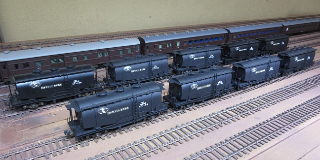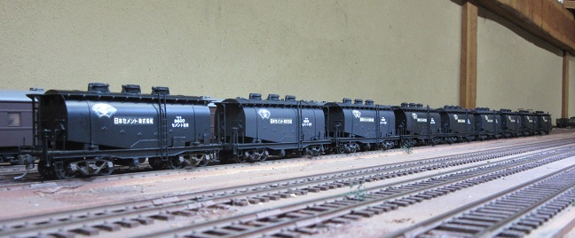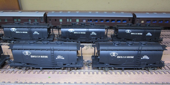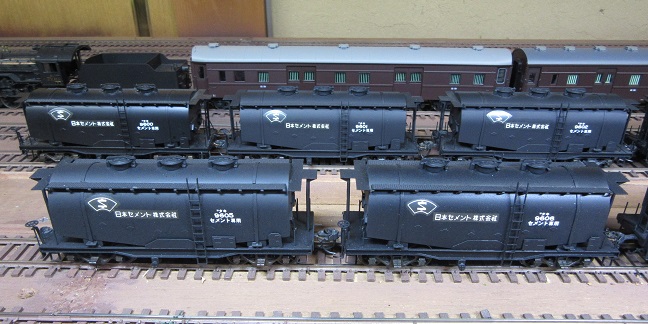 左は私の貨車キット組立第一号の安達製タキ9600。ナンバーを9675としていますが、実際は10両のみ製作され、9609までしかナンバーはありません。しかも所有会社は「第一セメント株式会社」です。そのデカールは有りませんので、今回も「日本セメント株式会社」にしました。9600のカマボコ型タンク車後継車の9050は「日本セメント株式会社」ですので、雰囲気つながりでこの所有者としました。中と右が、今回の増備車。