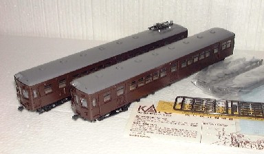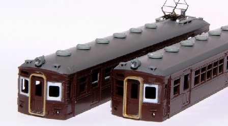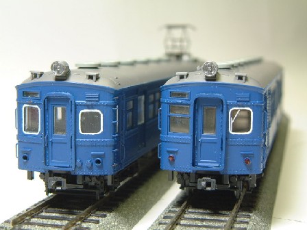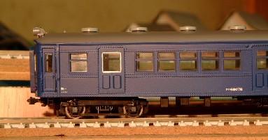 | 仕上げはGMの国鉄青20号を、やはりスプレーガンで塗装。 Hゴムは筆塗りです。下手なのですが仕方なく我慢しています。 サイドの客ドアのHゴム化は、クモハは6ヶ所全部、クハは3ヶ所改造。横桟を削り取り、透明塩ビを嵌め込んでいます。 |