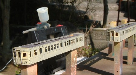 | 下塗りをGMの国鉄クリーム1号で元々の茶色が一応隠れる程度にスプレーガンで塗装。 スプレーガンはもっぱら、写真に見えるタミヤのスプレーワークセットを愛用。 |