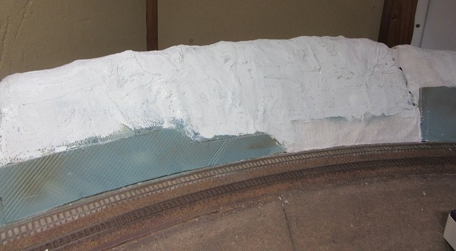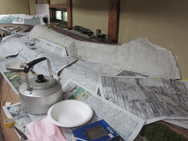 (2025.9.30) これまでプラスタークロスにて大体の地形を作ってきましたが、今回はこれにプラスターを塗って行きました。 これまで数々の製作記事が発表されていて、その都度、熟読している積りでしたが、いざ自分でその作業をする段階で「どうするんだったっけ????」ってなるんです。 紙のお皿と水を用意しました。 |