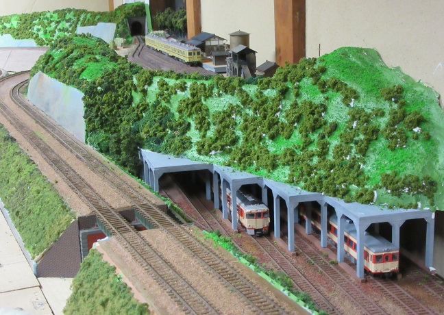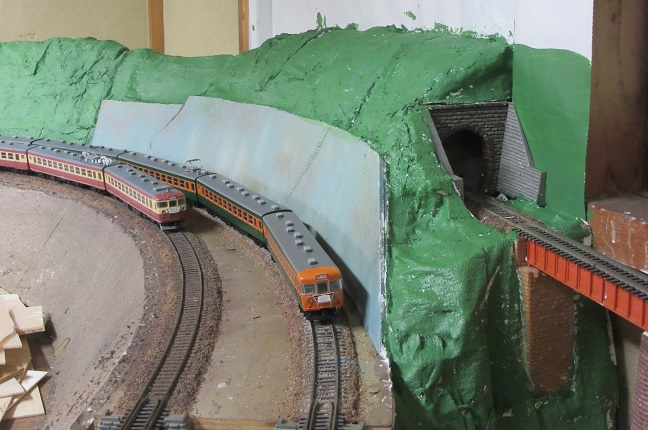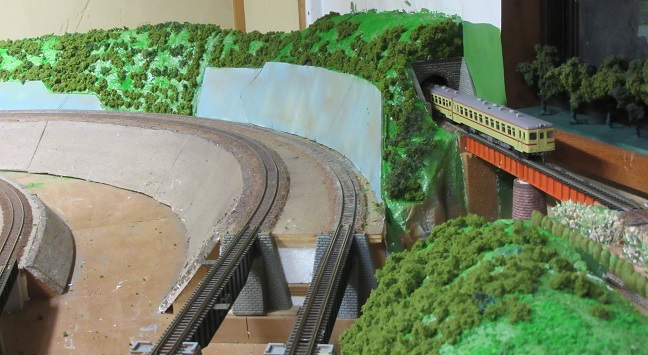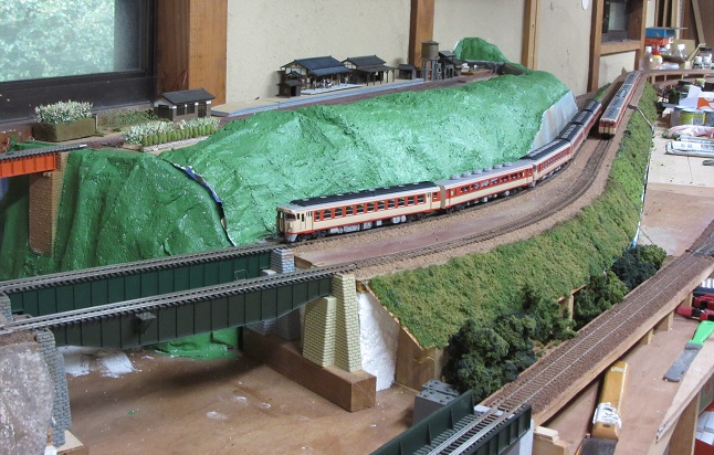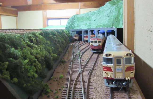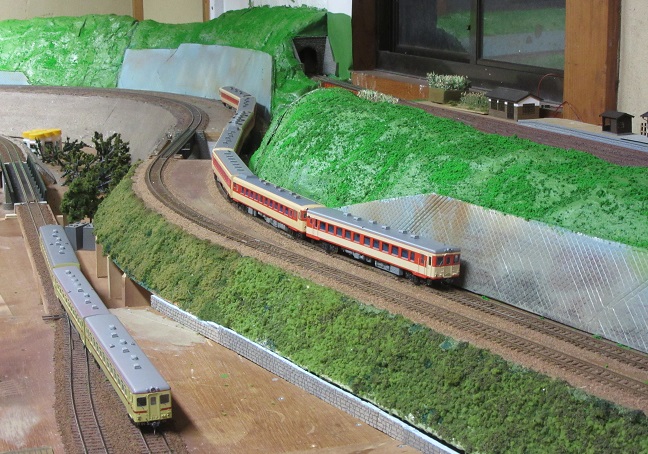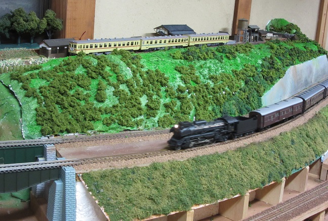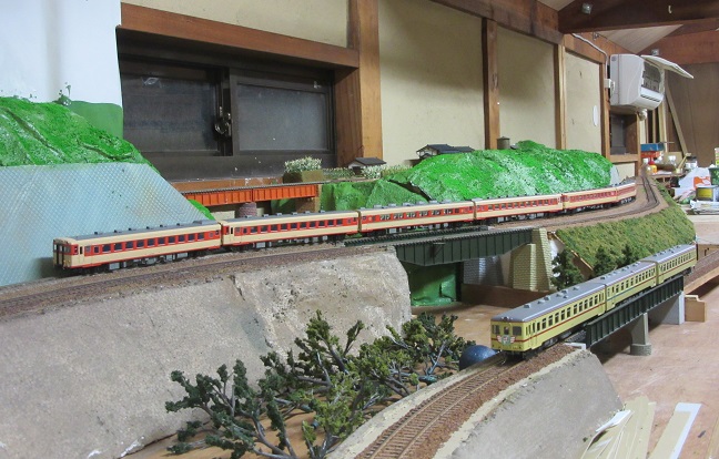 (2025.10.12) 右は準急「ちどり」です。 本線と支線の間に見える木々はプラスチック製の樹木ですが、昔々取り付けたスポンジを引っ剥がしている状態です。 |