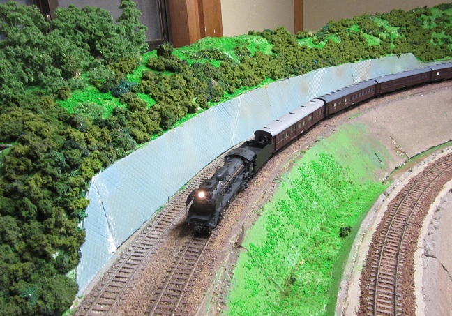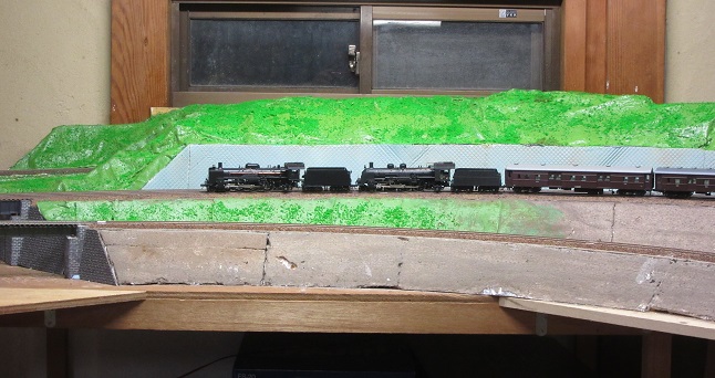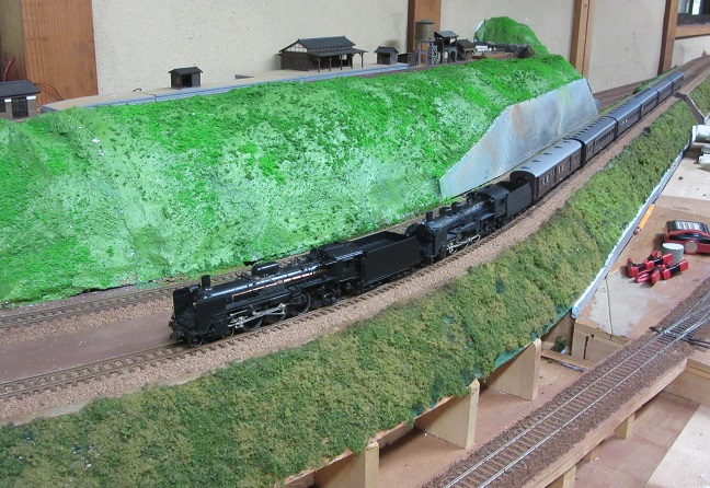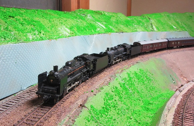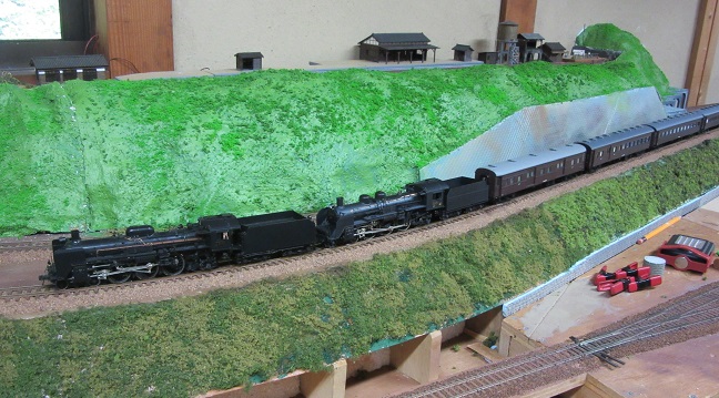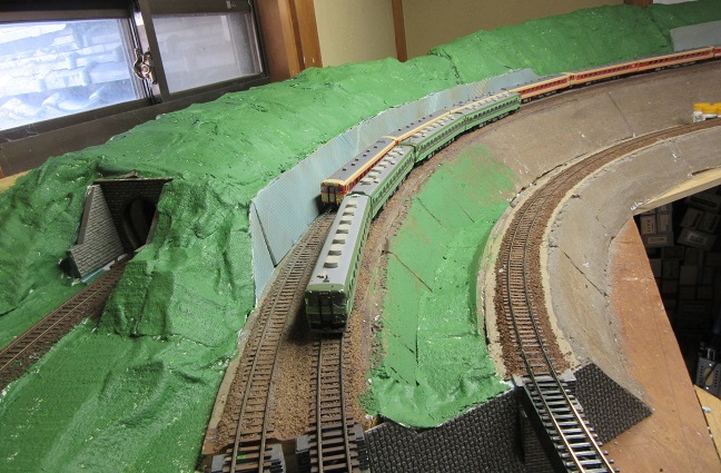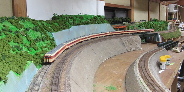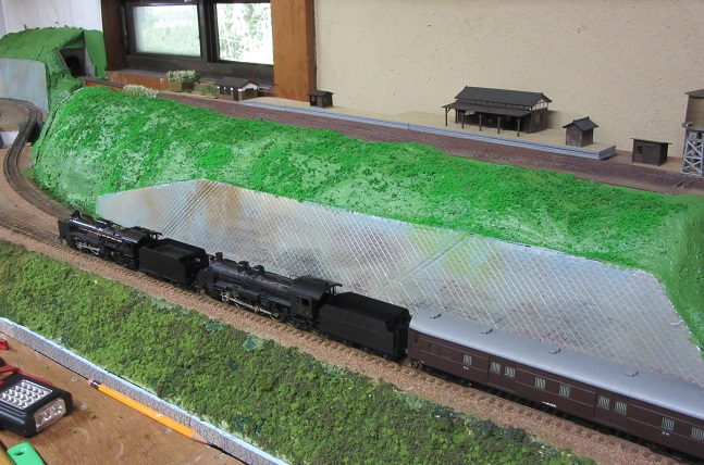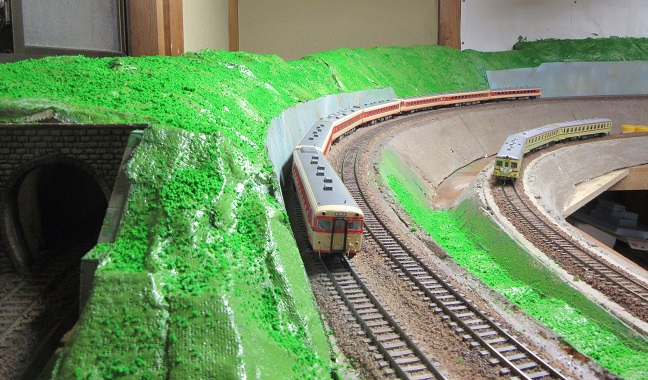 (2025.10.5) 本線のヤード側築堤にも草を植え付けました。 ちなみに、80系DC特急「かもめ」は11両編成、475系電車急行「つくし」は10両編成です。 |