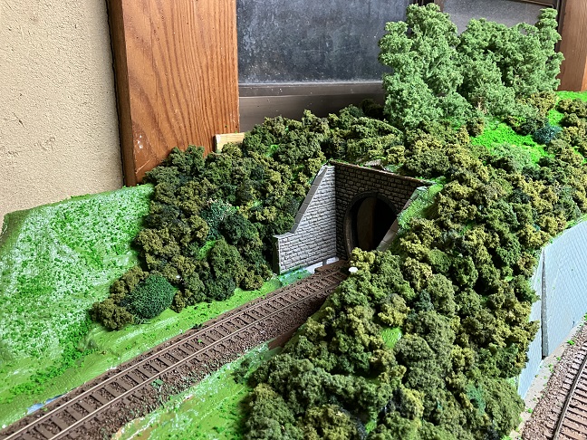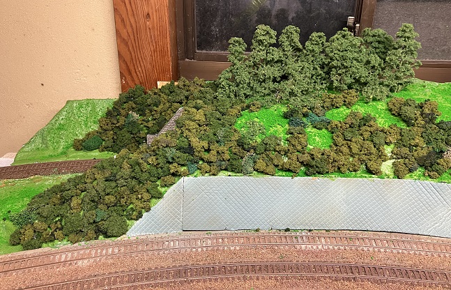 (2025.11.23) ヤードの上部分、スポンジ製の低木を貼り付けていきます。この写真では、まだボンドの白色が見えていますが、何れ白は消えて無くなります。 |