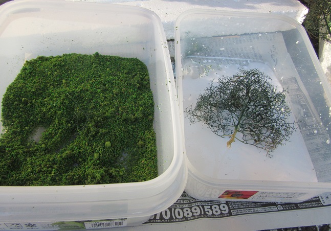 (2025.11.23) 左は葉っぱの材料、グリーンと言っても黄緑を多めに濃緑を少なめに、ターフを用意。 右は木工ボンドを水で薄めた液に木の材料を濡らしたところ。 |